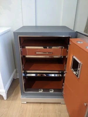 Ngay khi mở két, người dùng sẽ được chiêm ngưỡng hệ thống nội thất bọc da PU chắc chắn. Phần da này được hoàn thiện vô cùng tỉ mỉ và chắc chắn, đi cùng với viền kim loại sáng bóng, cao cấp.